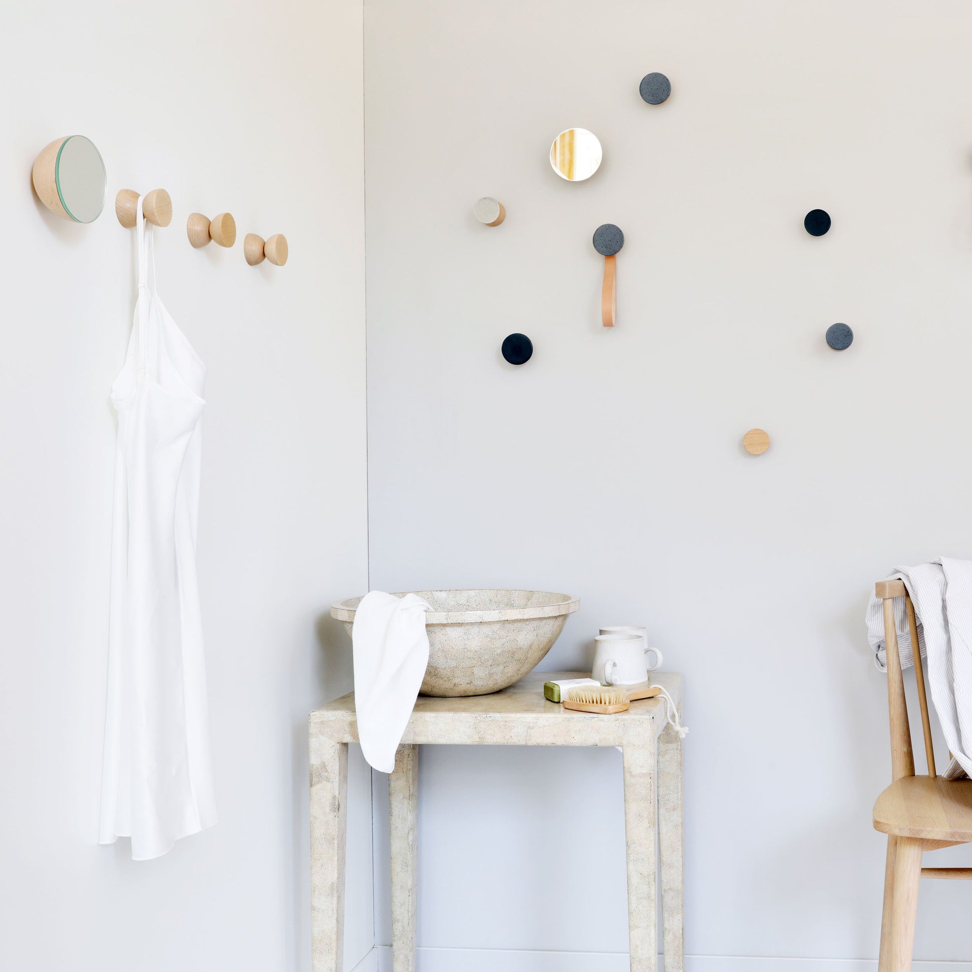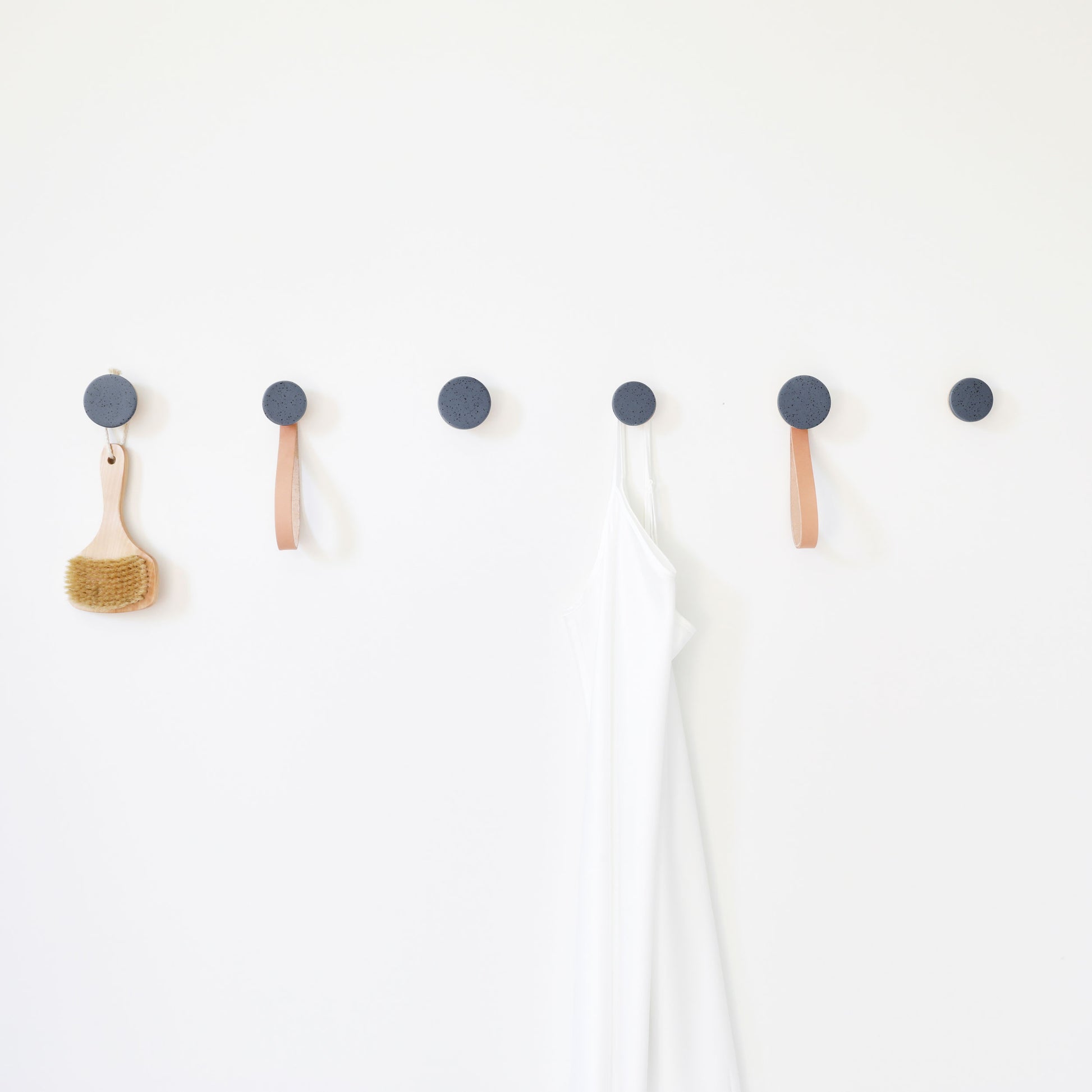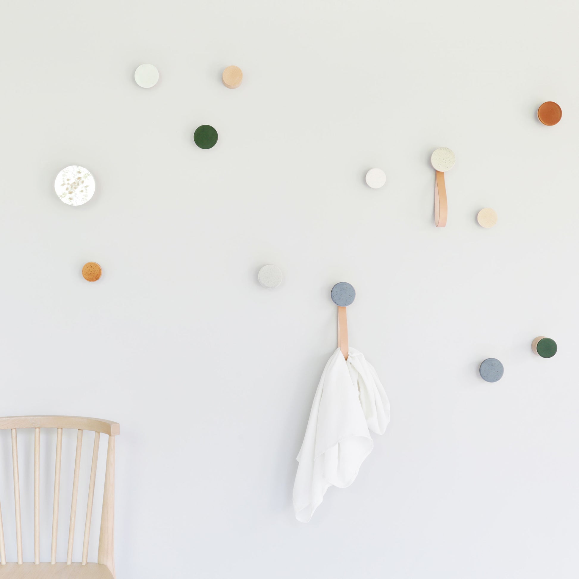 Die komplette Kollektion an wandmontierten Kleiderhaken umfasst Wandhaken aus Buchenholz mit einer Auswahl an Messing-, Kupfer-, Aluminium- oder Keramikoberflächen und der Option, eine natürliche Lederschlaufe hinzuzufügen. Die Haken bestehen aus einer halben Kugel aus massivem Buchenholz, die mit einem unsichtbaren Schraubsystem an die Wand gehängt werden kann. Die runde geometrische Form verleiht den Haken ein modernes Aussehen, vermittelt aber durch die Verwendung natürlicher Materialien eine warme Haptik. Eine sehr stilvolle Art, Ihren Mantel und Schal aufzuhängen.