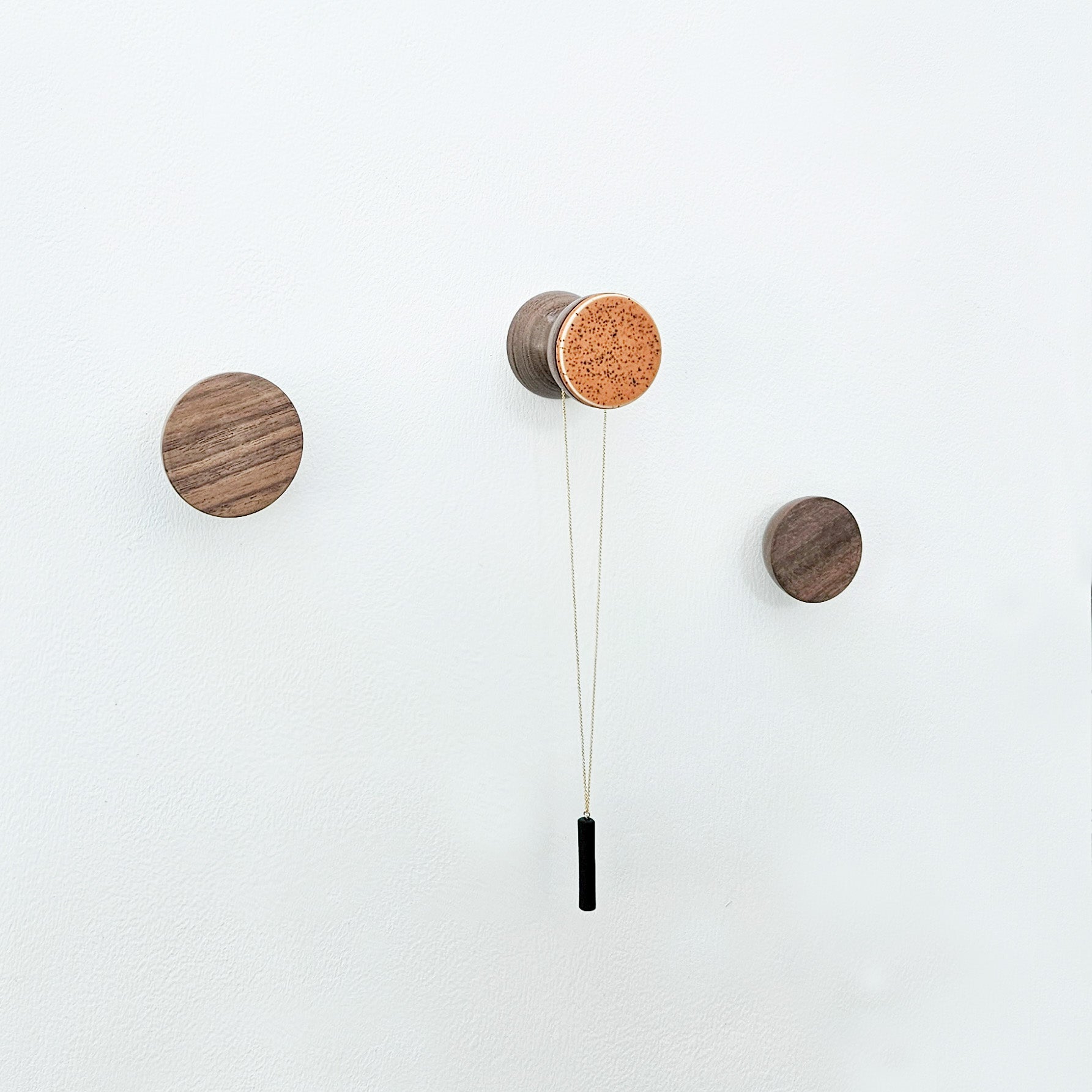 Modern and exclusive dark walnut wood wall mounted coat hook with a speckled terracotta ceramic front, resulting in a unique and eye-catching piece of decoration in your interior.