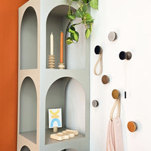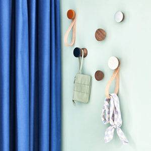 The full collection of coat hooks contains beech wooden and walnut wooden hooks with a choice of brass, copper, aluminium or ceramic front finishes and option to add a natural leather loop. The coat hooks are strong and have a easy to hang screw system. The hooks are fixed with a strong mounting system allowing them to easily carry a heavy weight. For alternative use a bolt is provided to be able to fix on a door or cabinet to serve as a wooden knob. The round geometric design shape give the hooks a modern appearance but have a warm feel due to the use of natural materials.