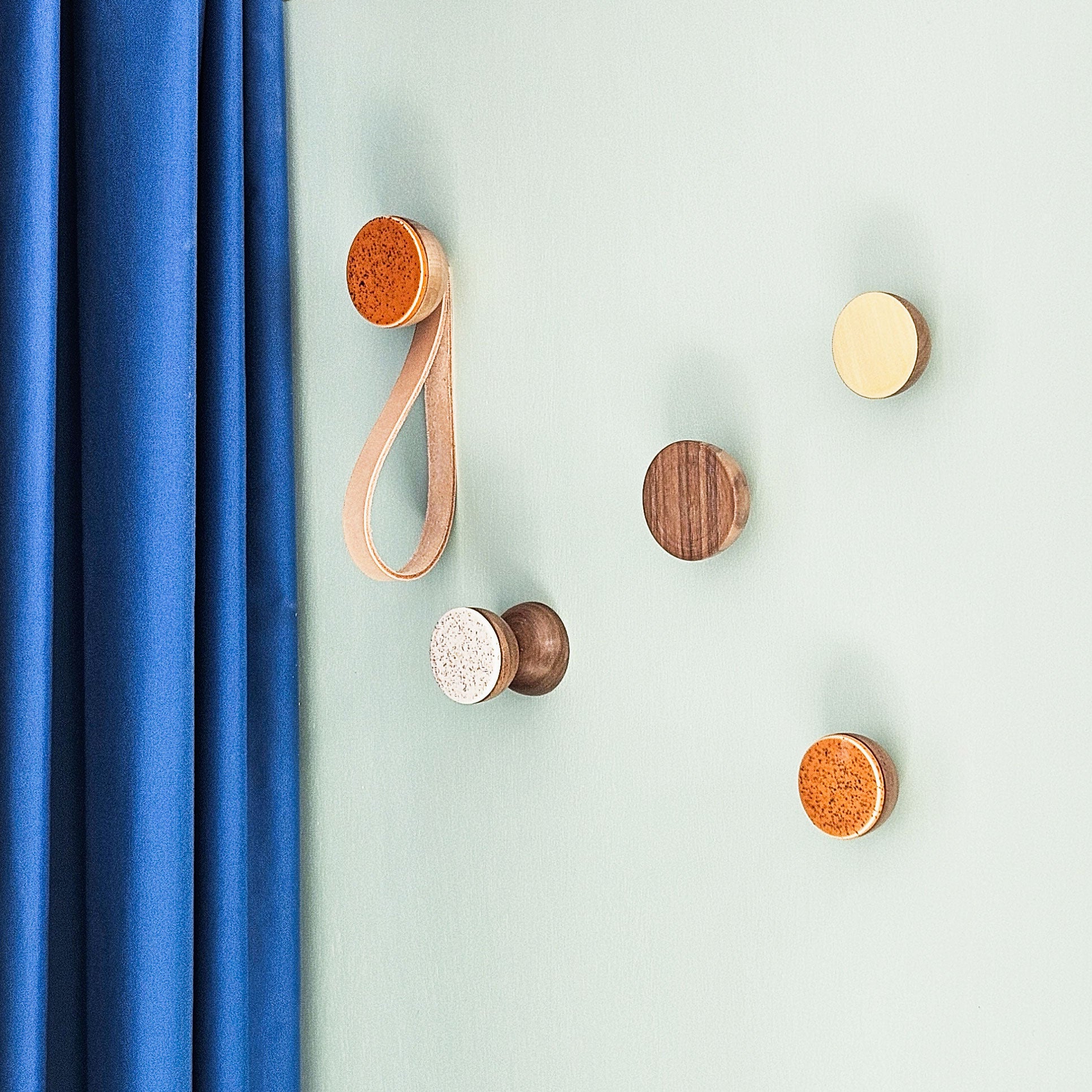 Discover our full collection of unique design wall mounted coat hooks / knobs / hangers with a choice of brass, copper, aluminium or ceramic finish and option to add a natural leather strap for hanging clothes and other fashion accessories in your interior. The different styles, designs and colours allow you to endlessly combine to create your own personal interior design style. The round minimalist shape of the coat hooks add a modern touch to your decor, with an exclusive feel due to the use of dark walnut wood.