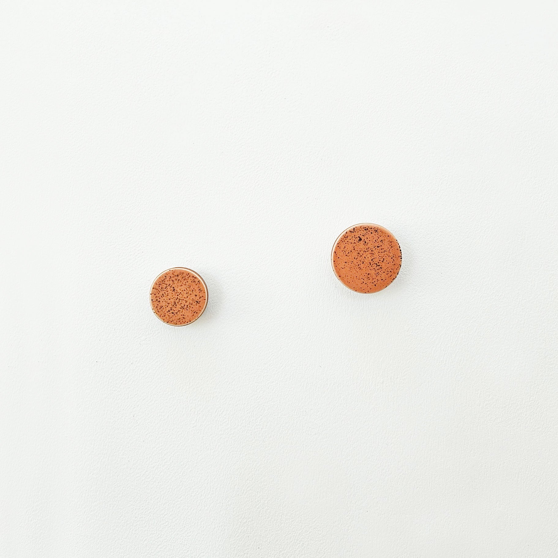 Round walnut wood wall mounted coat hook with a ceramic front in a speckled terracotta colour, resulting in a minimalist yet natural style.